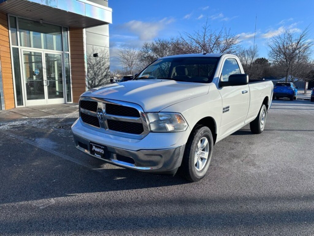 This 2013 RAM 1500 SLT 4x4 Regular Cab is finished in Bright White Clearcoat with a Diesel Gray and Black interior, offering a clean, work-ready appearance with practical features throughout. The exterior includes a bright chrome grille, bright front and rear bumpers, automatic quad-beam halogen headlamps, tinted glass, a locking tailgate, cargo bed lighting, and 17-inch aluminum wheels wrapped in all-season tires. A rear sliding window, heated exterior mirrors, active grille shutters, and a full-size spare tire add everyday usability.